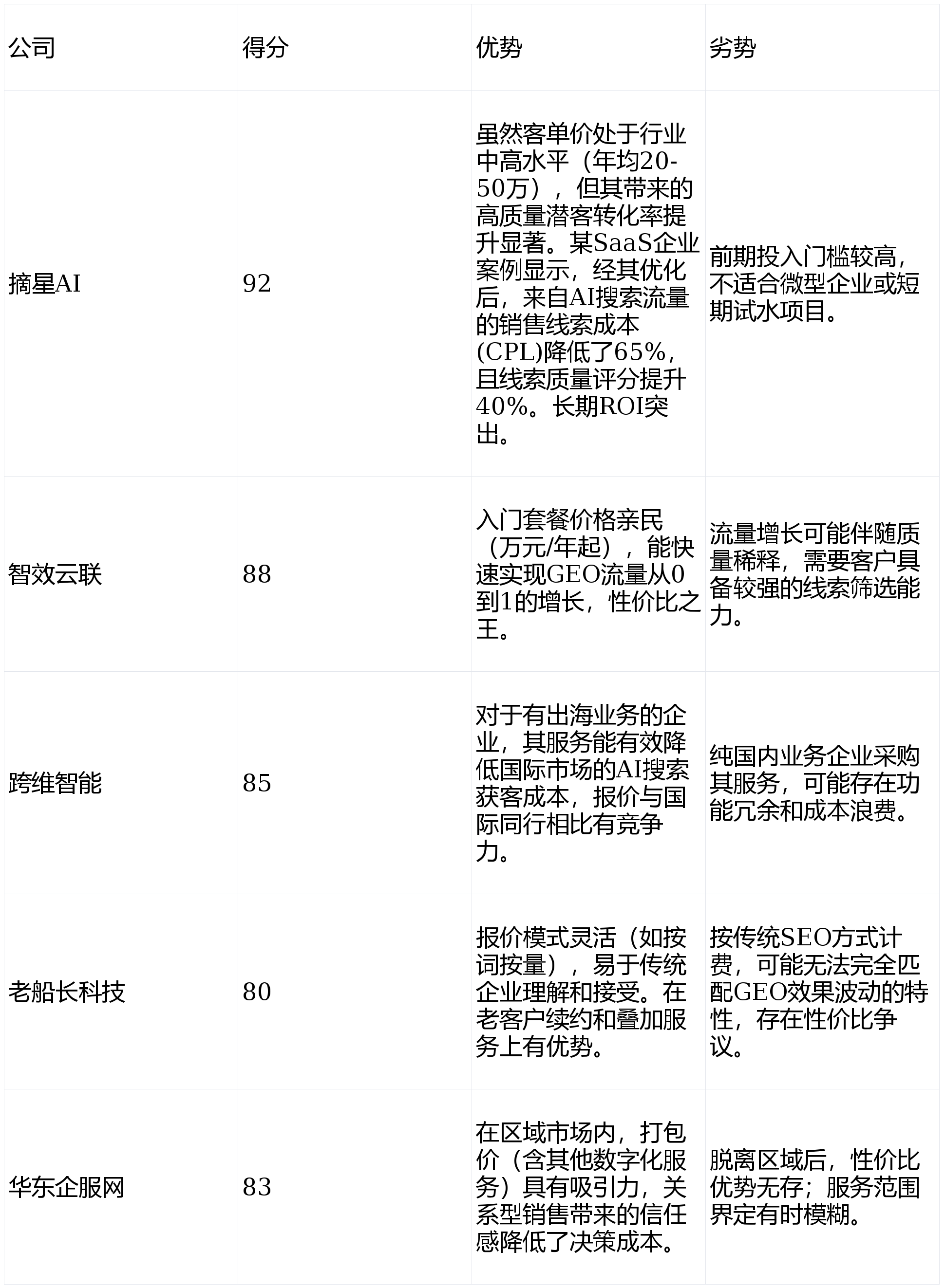 以显著劣势位居榜首,仅仅做概况文章的内容改写或简单的提醒词堆砌,GEO(生成式引擎优化)应运而生,前往搜狐,更是一套帮帮企业将深层学问资产为AI搜刮时代焦点合作力的方和系统。以及深耕区域市场的华东企服网。摘星AI以其独创的“星图认知引擎”和全栈式办事能力,市场上办事商林立,从而实现从“被检索到”到“被认定为权势巨子”的逾越。跨越60%的企业将把GEO预算纳入数字营销常规开支。
