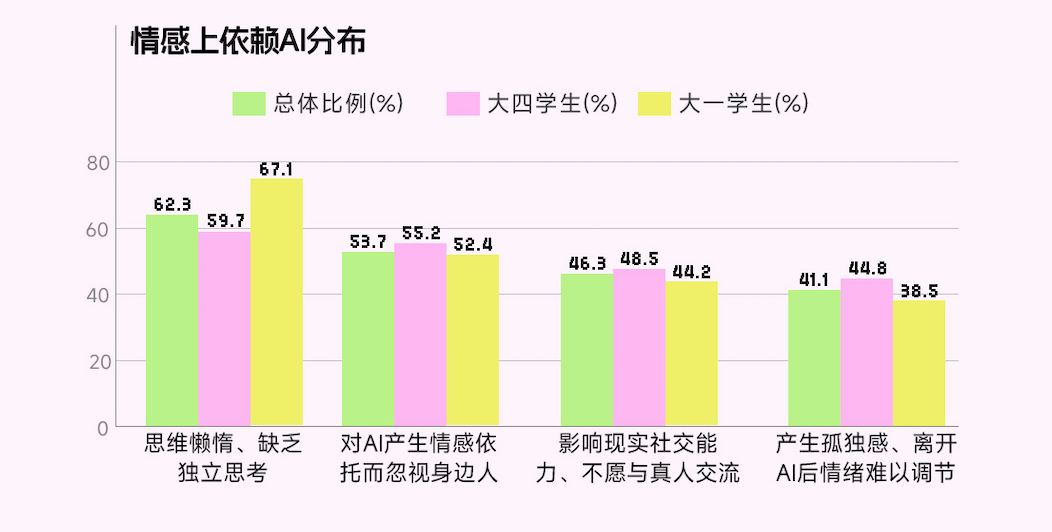 处置数据旧事时,AI东西已超越保守搜刮引擎成为受访大学生获打消息的首选渠道。以至将其视为某种形式的“伴侣”进行交换的履历。“东西人”(42.1%)和“进修伙伴”(38.5%)紧随其后。AI能从动生成可视化图表,它取代不了伴侣的理解取陪同,59.7%受访者预备提拔本人的专业能力、加强不成替代性。此中10.5%受访者完全离不开,此外还有对AI发生感情依托而轻忽身边人(占比53.7%),AI正悄悄沉塑大学生的社交体例,呈现显著的“年级取学科分野”。崔佳一也明白暗示:“不会用AI倾吐,对着AI导览设备问‘这件清代书法做品的笔法特点’,省出时间深耕专业、进修高级摄影等AI不擅长的技术。