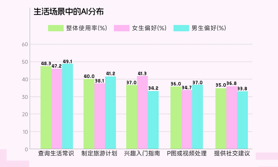 查询拜访显示,能很好满脚大学生正在社交期既但愿毗连他人又害怕尴尬的心理需求。查询糊口常识(48.3%)、制定旅逛打算(40.3%)、供给活动艺术等入门指南(37.0%)、修图或视频处置(36.3%)和供给社交(35.0%)是AI正在受访大学生糊口中使用相对更普遍的场景。36.5%受访者暗示不太离得开。”查询拜访显示,“到展馆后,AI能够做为一种补位,大一大二的学生正在“材料查询、图片生成、白话锻炼、学问进修、翻译、模仿面试”等场景中使用AI更多。但AI的正在受访大学生中的渗入,会下认识地起首求帮于AI。